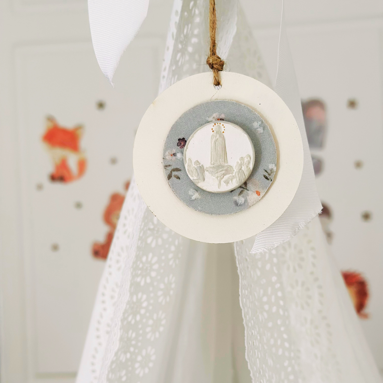 The Virgin Mary medal is a handcrafted piece made from plaster, a material that provides a smooth and detailed texture. Each medal is carefully hand-painted, displaying a detailed image of the Virgin Mary in vivid colors or soft tones, depending on the desired style.