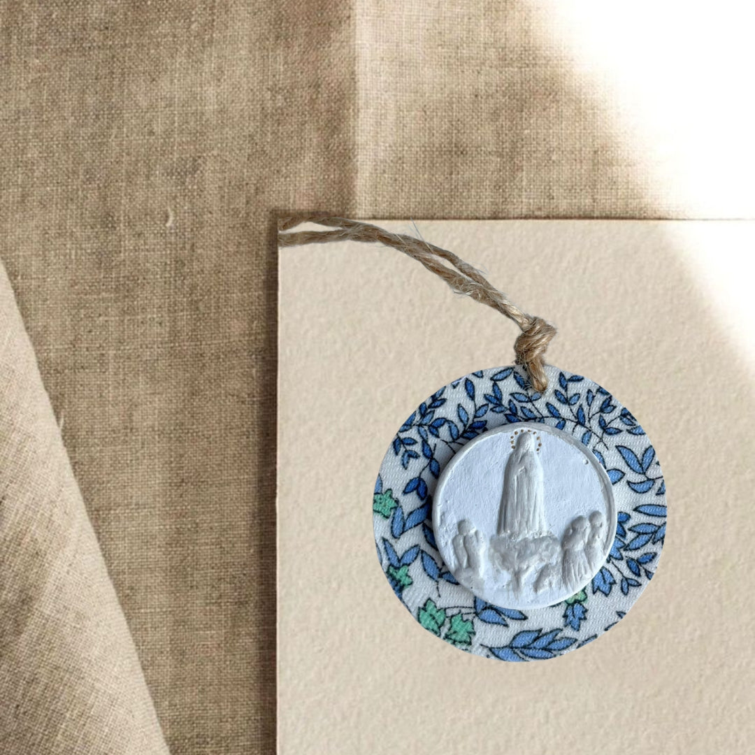 La medalla de la Virgen de Fátima es una pieza artesanal elaborada a mano con escayola, un material que proporciona una textura suave y detallada. Cada medalla está pintada a mano con esmero, mostrando una imagen detallada de la Virgen en colores neutros o tonos suaves según el estilo deseado.